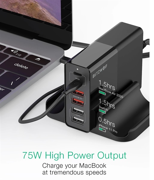 BlitzWolf® BW-S16 stazione di ricarica da 75W con 6 porte USB / USB-C adatto per PC portatili e Smarthphone