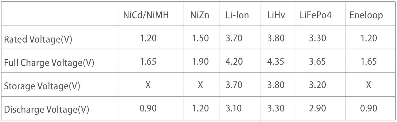 Qui trovi i vari voltaggi (tensione) di riferimento delle batterie di varie chimiche: